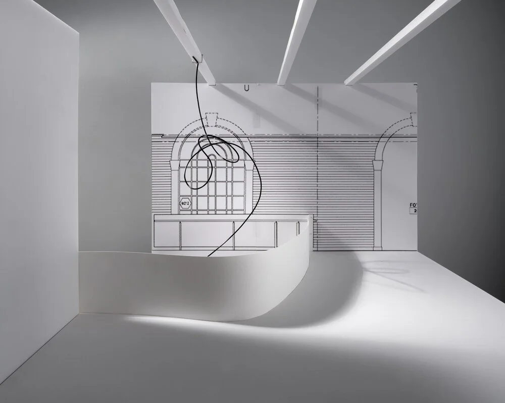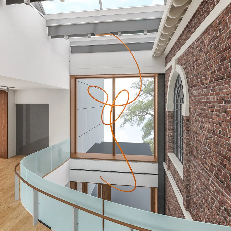 Grace Note is conceived as a gestural line in space. Capturing a flourish of upward movement, the sculpture is visible from outside the centre through the large second floor front window. Upon entering the centre Grace Note leads the eye of the viewer into the larger space of the building and its galleries with a joyful, orange, aerial twist.