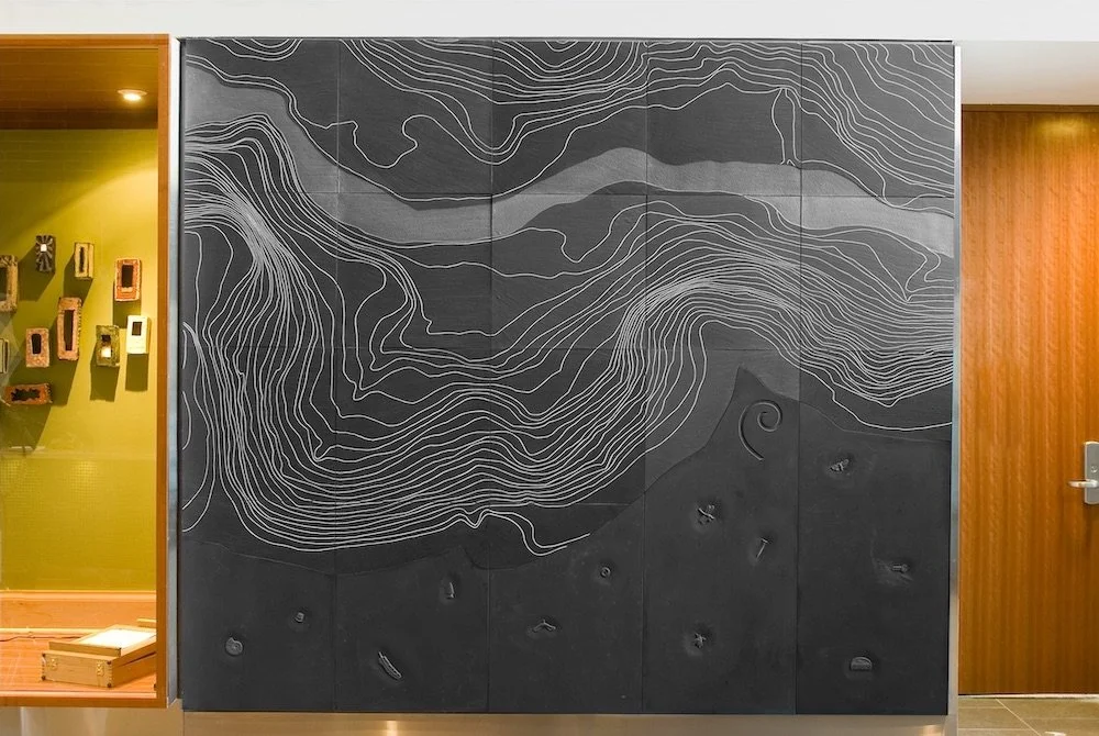 Landmarks is composed of a topographical map of the Holland Bloorview Kids Rehabilitation Hospital site and the adjoining ravine lands, sandblasted into natural cleft slate with white highlighting. Within the area of the Holland Bloorview Kids Rehabilitation Hospital property on this map, contemporary and historic fossil images have been carved into honed blackboard slate, from which the visiting and resident children can take paper and graphite rubbings.