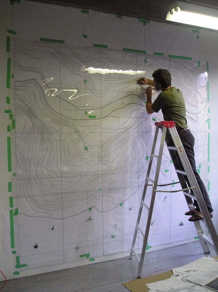 Landmarks, developing drawing in studio for sandblasted lines and hand carving on blackboard slate