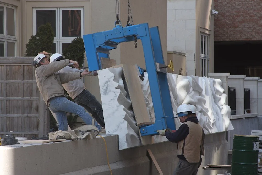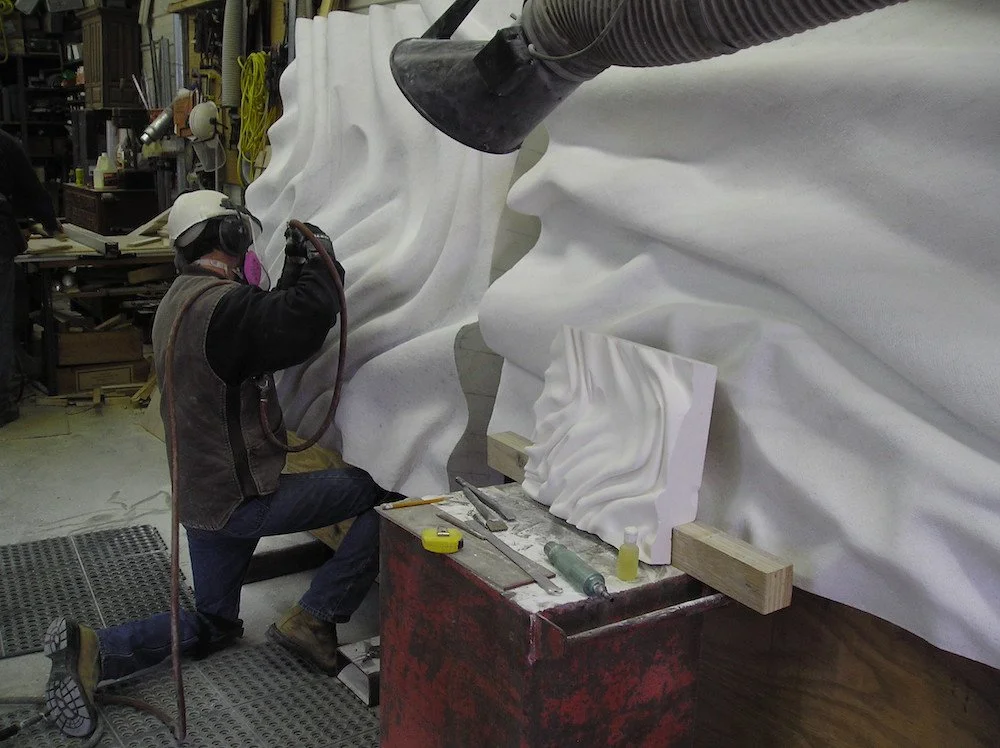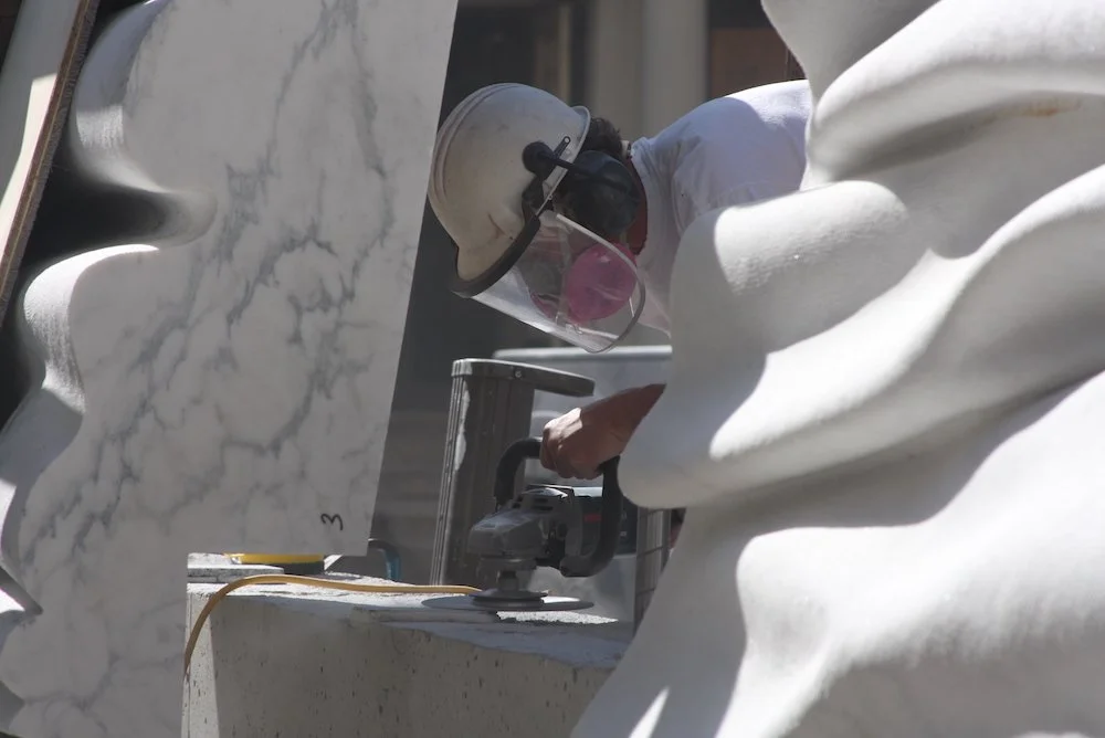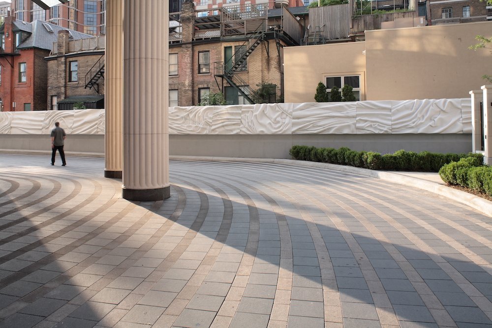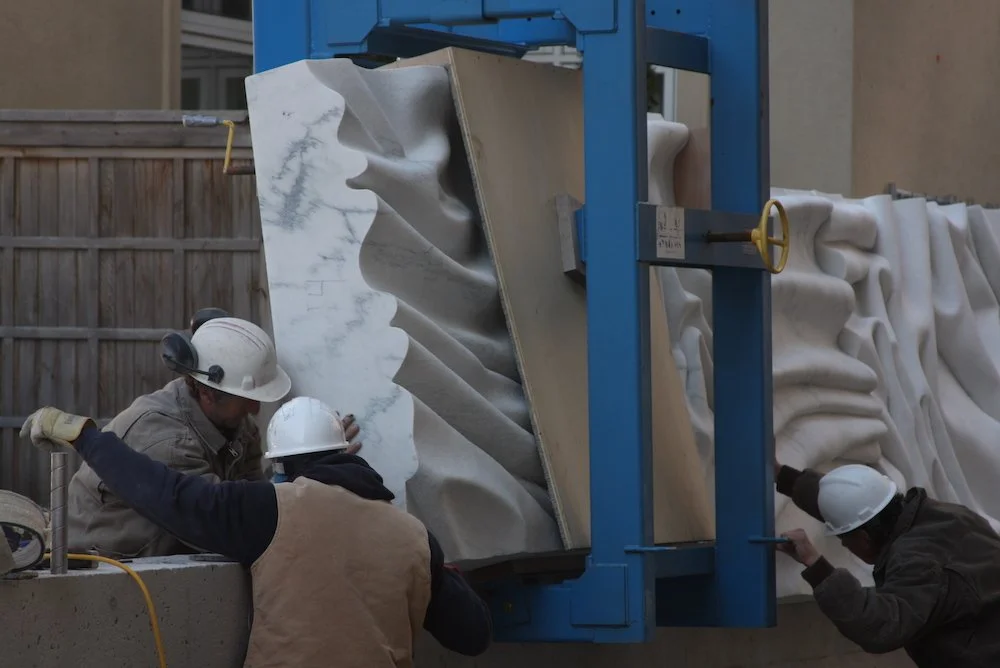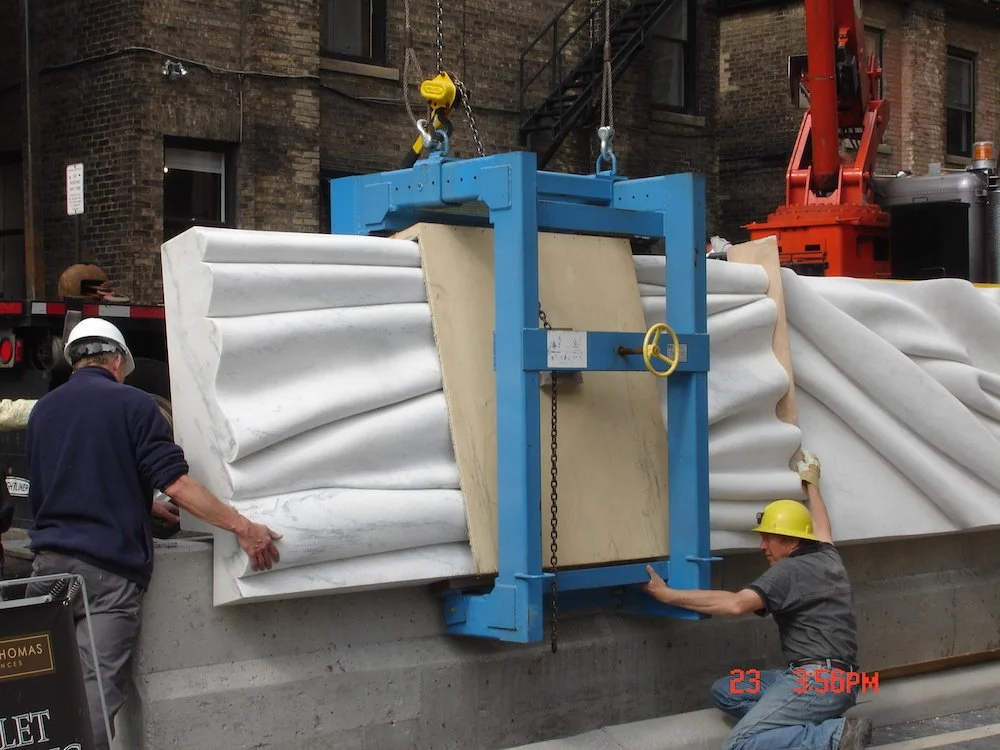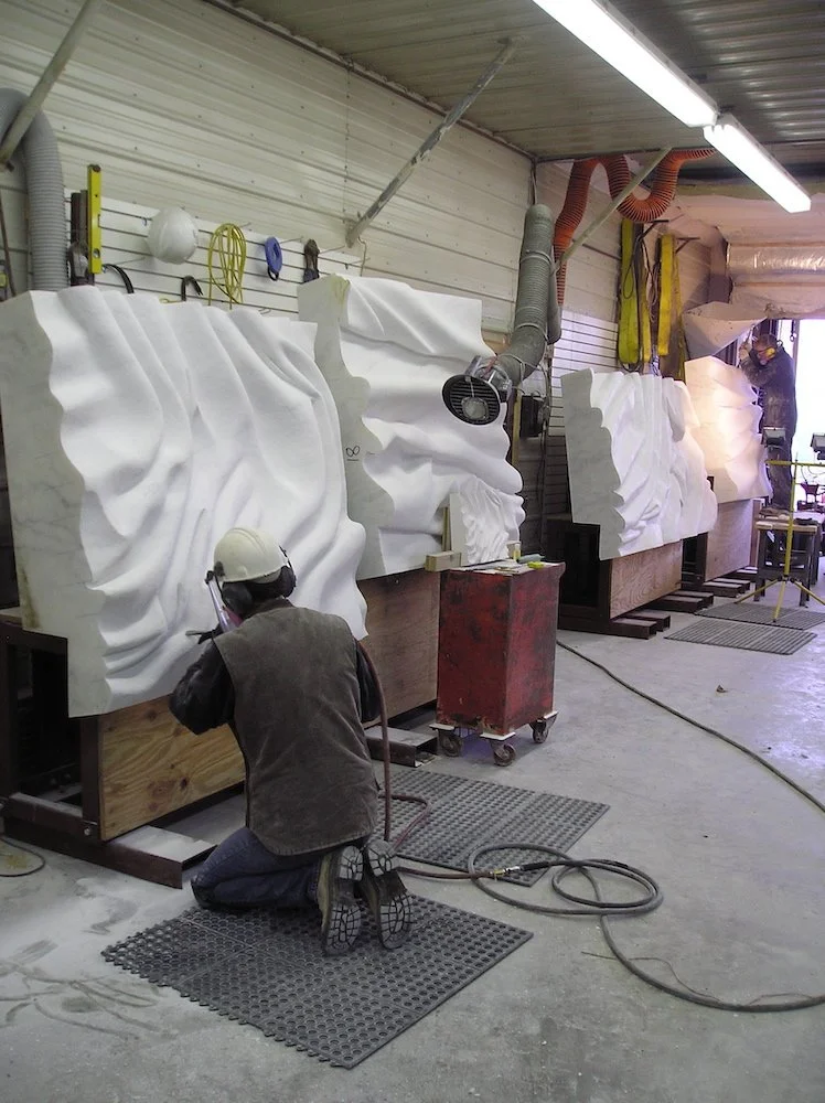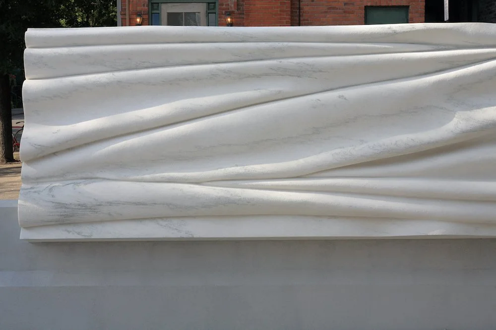 Shift consists of 20 individually carved marble sections of drapery with a total length of 136 feet, and a height of 52 inches. Balancing classical imagery with contemporary pictorial experience, this hand carved marble wall delineates the property line of One St. Thomas Street. Rather than rendering one long image of draped cloth in stone along this border, the cloth imagery is fragmented, moving it away from a literal reading to a sequenced sampling of cloth images, producing a cinematic effect. Drapery imagery was chosen to complement the classical features referenced in the adjacent condominium architecture. The surfacing of the wall was carved in a crosshatch manner to suggest the warp and weft in the weave of cloth. The carved face of the wall is angled so as to be visible not only from the ground but also from the above viewpoints of the surrounding town house and condominium buildings.